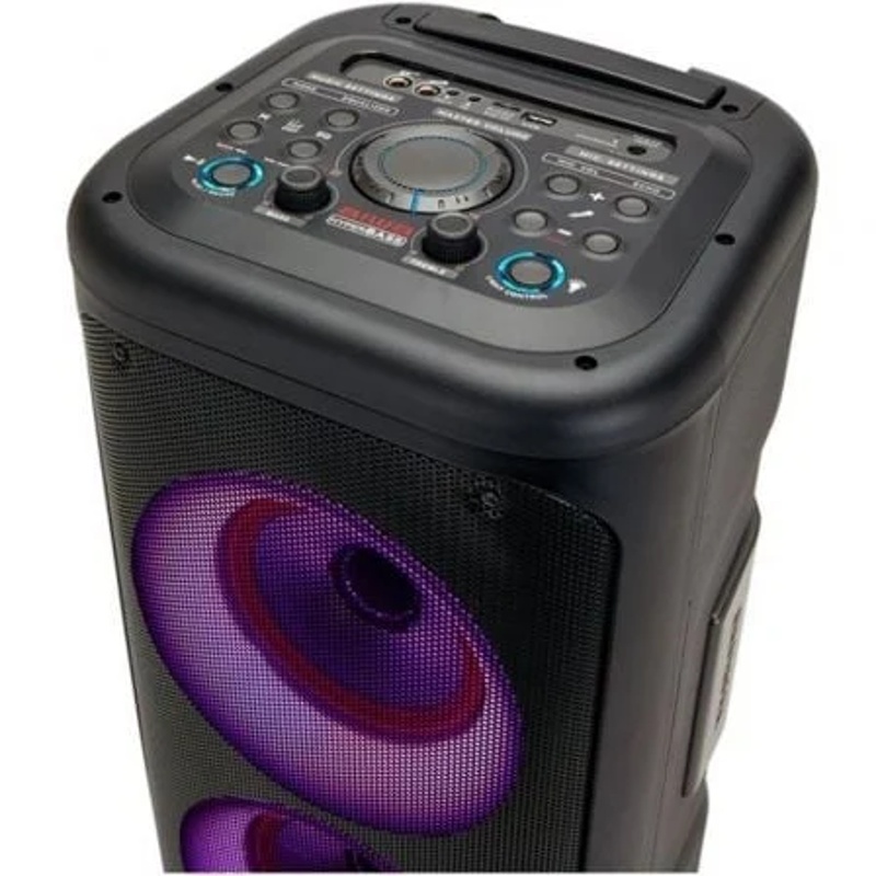El altavoz portátil Aiwa KBTUS-450 cuenta con una potencia de 350 W y tecnología Bluetooth para la conexión inalámbrica. Incorpora HyperBass para una mejora en la reproducción de graves. Dispone de luces LED que reaccionan al sonido, añadiendo un elemento visual durante su uso. Su diseño incluye un handle para un transporte sencillo. El dispositivo tiene una batería recargable que permite un uso prolongado sin necesidad de una conexión a la red eléctrica. El altavoz es compatible con dispositivos Bluetooth, incluyendo smartphones y tabletas, así como con dispositivos de audio a través de entradas auxiliares. La construcción y los materiales utilizados aseguran un funcionamiento en diversas condiciones de uso. Este altavoz presume de un sistema de audio destinado a encuentros sociales y eventos al aire libre.